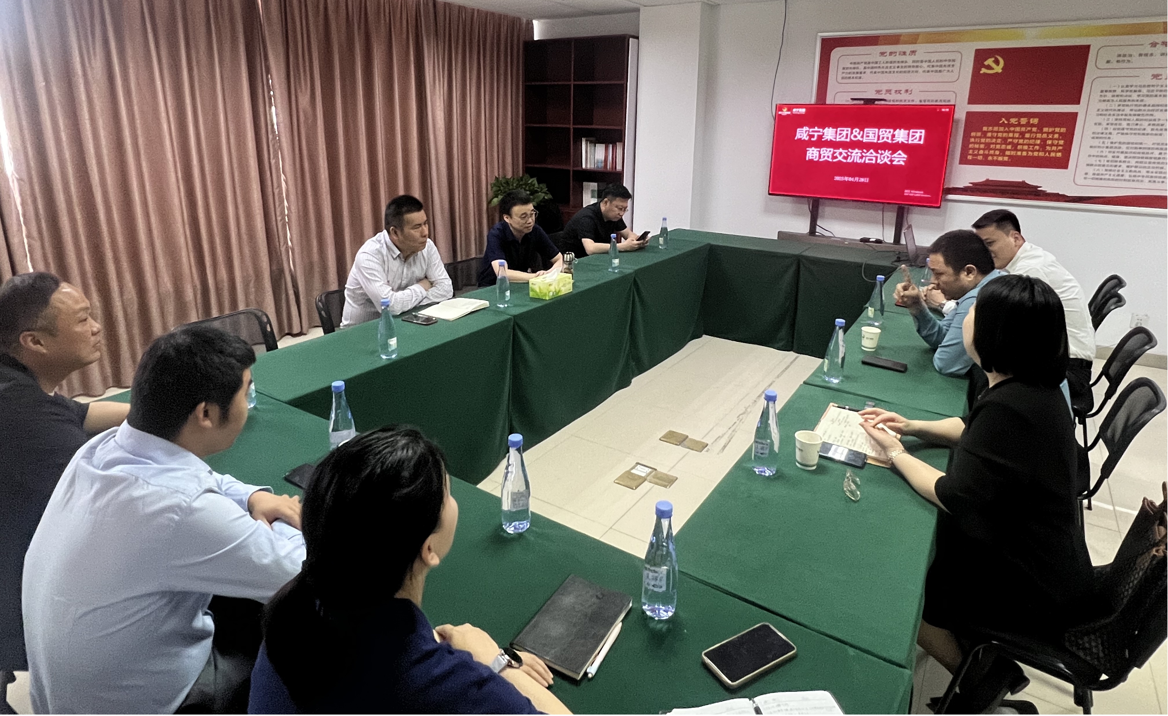 4月28日,國(guó)貿(mào)集團(tuán)旗下湖北國(guó)貿(mào)農(nóng)產(chǎn)品有限公司總經(jīng)理李華勇一行到訪咸寧集團(tuán),雙方圍繞商貿(mào)合作事宜展開座談交流。此次交流旨在深化彼此了解,探尋合作契機(jī),共同推動(dòng)咸寧商貿(mào)領(lǐng)域高質(zhì)量發(fā)展。咸寧集團(tuán)黨總支副書記、總經(jīng)理駱威主持會(huì)議,集團(tuán)黨總支委員、副總經(jīng)理張偉,集團(tuán)總會(huì)計(jì)師張?jiān)品?,集團(tuán)副總經(jīng)理吳鋒以及商管分公司全體參加。